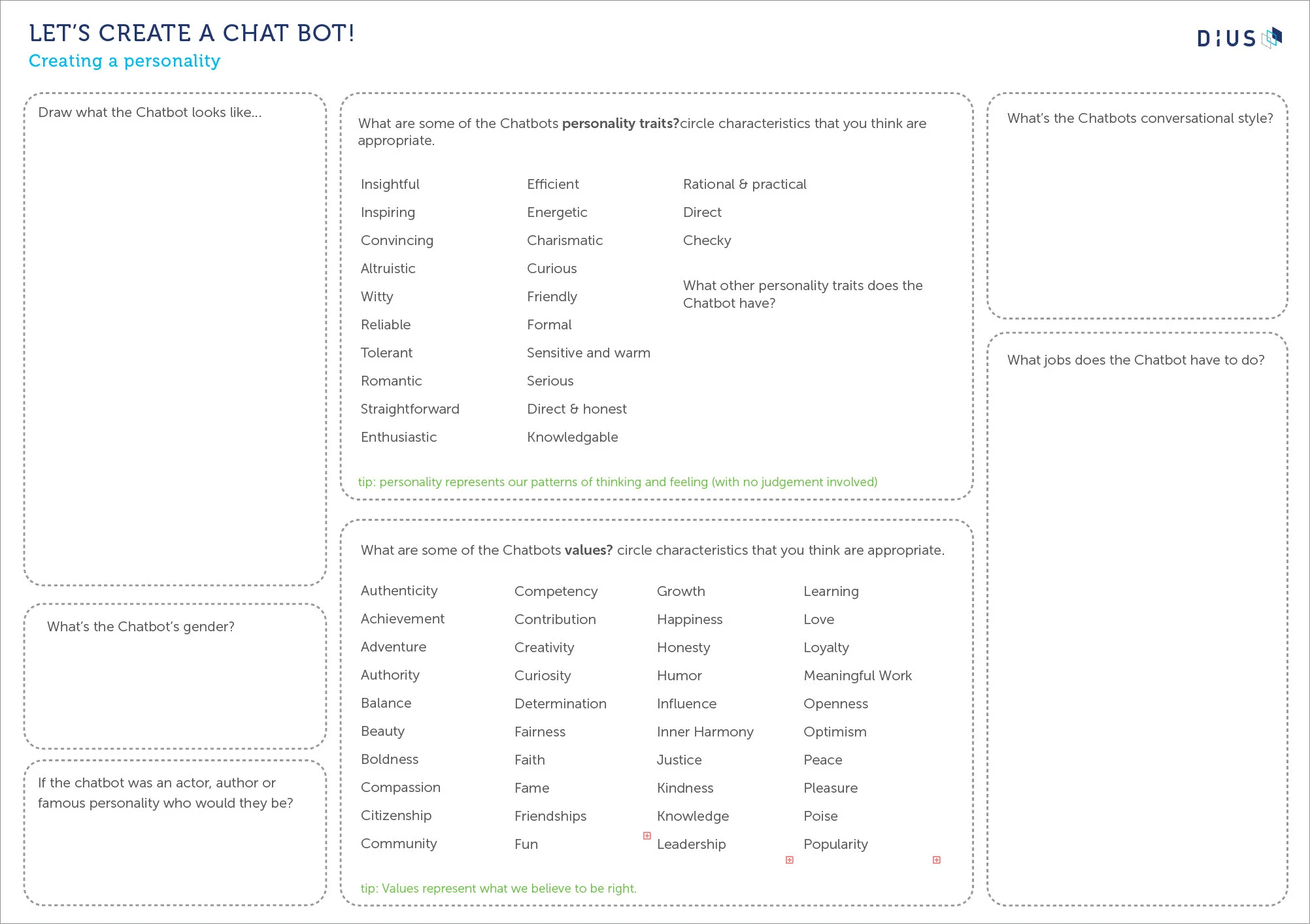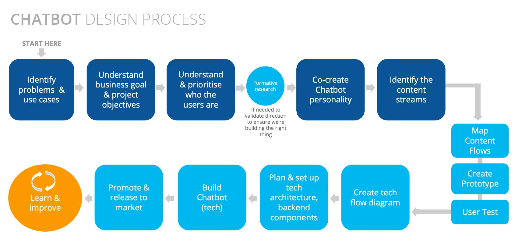 Below I’ve outlined the process and tools that I’ve used when creating chatbots. The approach is collaborative and human centred.