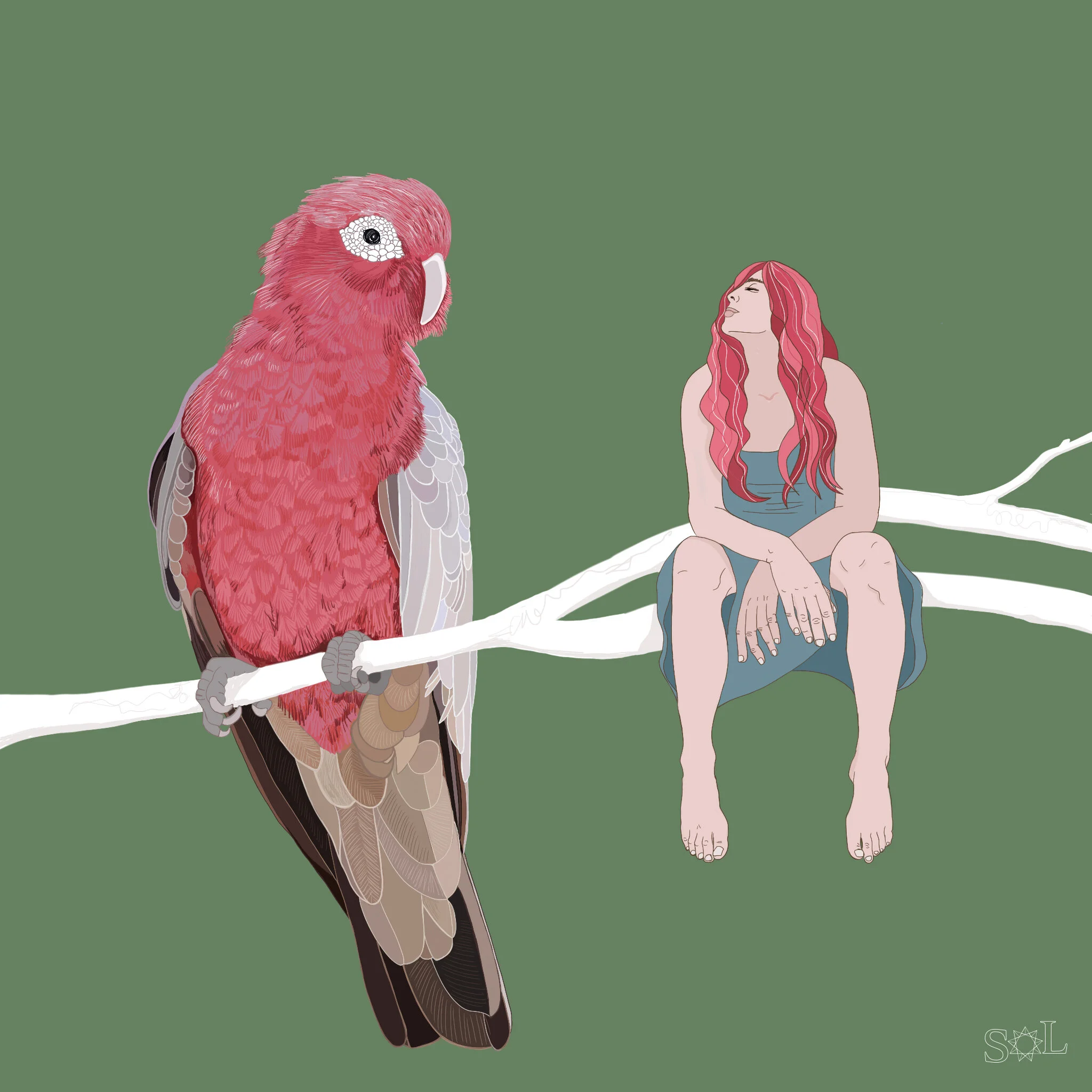 "They Spent Hours Perched On The White Gums Discussing The Underlying Meaning Of Everyday Life" was initially inspired by the Galah; A super chatty Australian cockatoo, who I often hear whilst I'm working in my Sydney studio. I often wonder what birds and animals say to each other, or what goes on in their heads. This artwork aims to capture 'my' wishful moment, in which a human and feathered creature, sit side by side, in deep conversation, as equals.